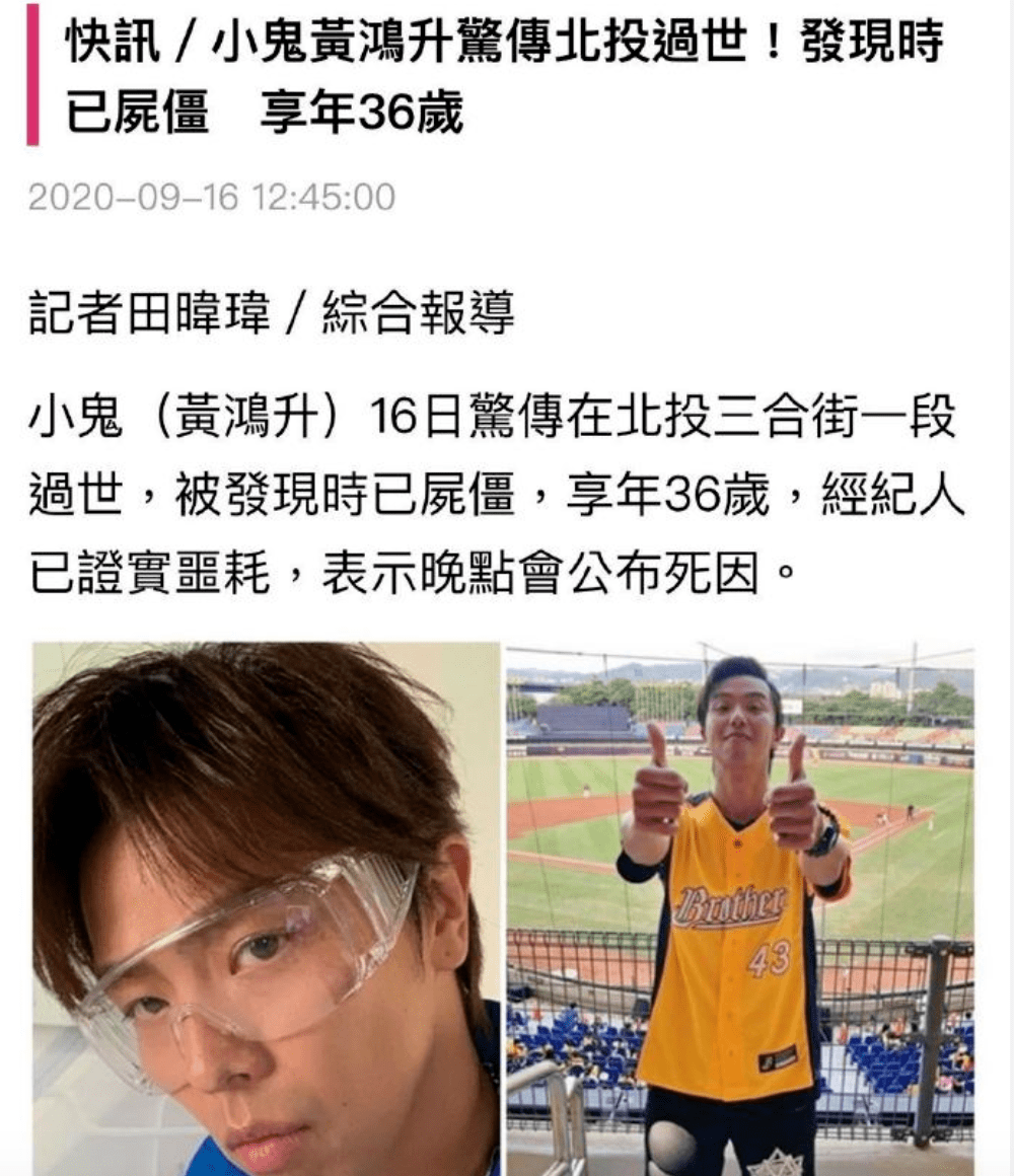 2020年真是多事之秋,娱乐圈频传噩耗,如今台湾男星小鬼黄鸿升,也被曝去世,享年36岁。