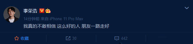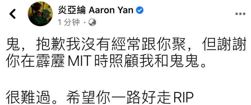 李荣浩、炎亚纶纷纷发文悼念黄鸿升,“我真的不敢相信,这么好的人,朋友一路走好”,“鬼,抱歉,我没有经常跟你聚,但谢谢你在霹雳MIT时照顾我和鬼鬼,很难过,希望你一路走好RIP。”