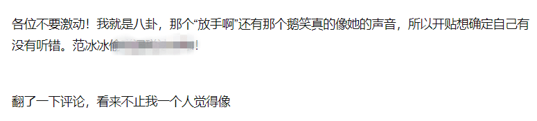 不过,也正是这个笑声的特殊性,引起了不少网友的注意,结合女声在这之前的一句“放手啊”,也是像极了范冰冰的声音,这也促使众多网友在评论区中直接询问李晨“是范冰冰吗?”,甚至有网友也是笃定地表示“这是范冰冰的声音”“那个女孩子应该是冰冰,你就承认了吧,我们会支持你们的”