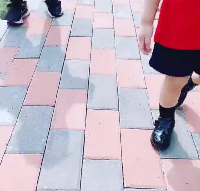 视频里可以看到,小星星穿着学校制服,红色上衣蓝色短裤搭配着黑色小皮鞋,非常正式呢,两条胖乎乎的小肉腿一晃一晃得走着独有的步伐,拽萌拽萌的,还真是“大哥范”十足呀!