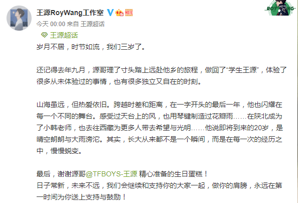 9月16日是王源工作室成立3周年的日子,工作室晒出王源送来的生日蛋糕,并发长文庆祝。工作室写道:“还记得去年九月,源哥理了寸头踏上远赴他乡的旅程,做回了‘学生王源’,体验了很多从未体验过的事情,也有很多独立又自在的时刻。”