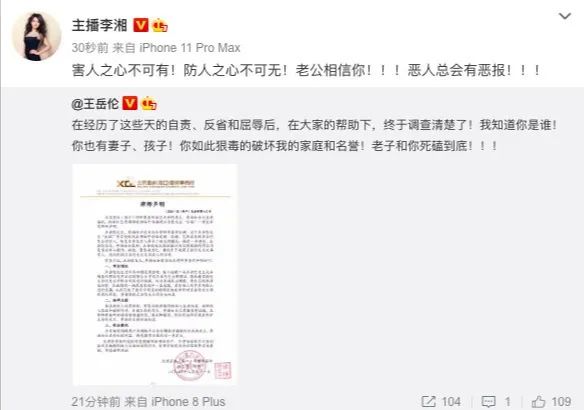 与此同时,事件发生后从未发过声的李湘,也在第一时间点赞并转发了王岳伦这条微博,表示“恶人自有恶报,相信你哟,老公...”。