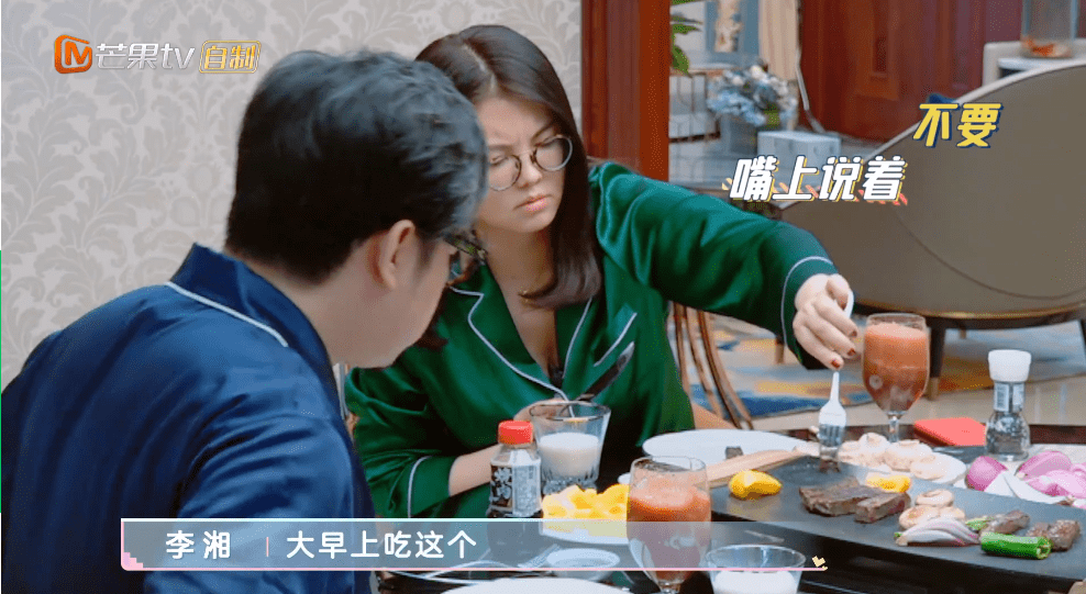 此前一直嚷着吃鸡蛋喝牛奶的李湘呢,一看见滋滋冒油的牛排,瞬间上演打脸现场,上手比王岳伦还快。