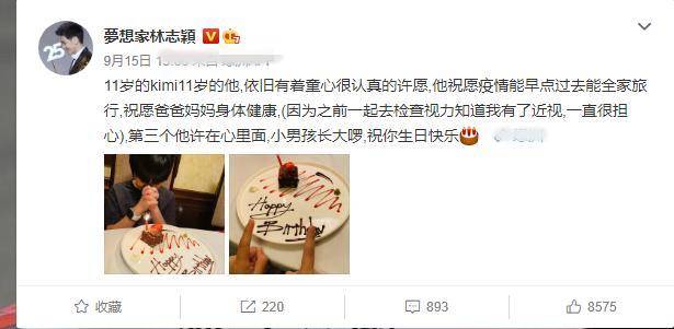 9月15日是Kimi的11岁生日,林志颖晒出儿子对着蛋糕低头许愿的照片,并曝光了儿子三个心愿中的两个,一个是希望能全家去旅行,另一个是祝愿爸妈身体健康。
