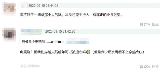 不过这部剧的播出平台是芒果TV,据说这部剧是2019芒果TV播放量最高的网剧,达到了23.5亿的播放量。不过仅以一个平台播放量为入围依据的话,也难免让人质疑这金鹰奖的标准是否有意偏向芒果台。再加上此前金鹰奖宣布了电视剧参选名单和主持阵容,王一博赫然在列,因此有网友揣测王一博可能最终会拿下观众最喜爱的男演员奖。