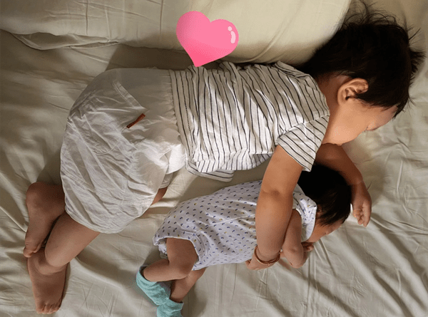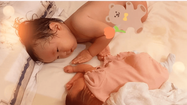 照片中,大儿子“嘟嘟侠”与妹妹“小花仙”同躺在一张床上,虽然兄妹俩都已深深入睡,但哥哥的手却紧紧抱着妹妹,包括身体语言也是朝着妹妹靠近,或许也是哥哥在身旁陪伴的缘故,妹妹“小花仙”睡得也是格外香甜。