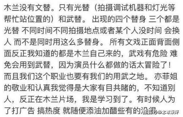 据悉,刘亦菲在戏中基本上都是亲力亲为,但有些武打动作实在太危险,所以就让武替去排雷,以确保刘亦菲后续拍戏的安全,这也算是武替的职责所在,无关敬业吃苦一说。