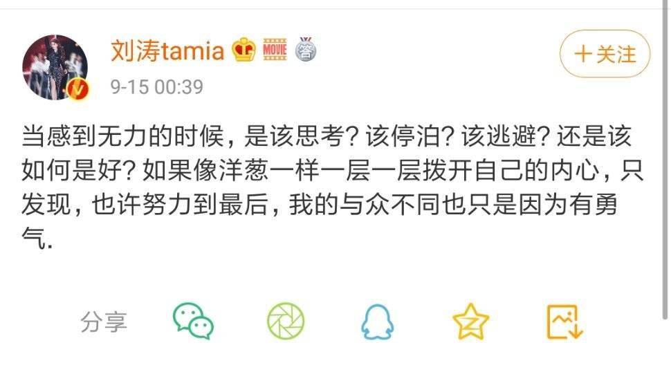 9月15日刘涛在个人社交平台上发文:“当感到无力的时候,是该思考?该停泊?该逃避?还是该如何是好?如果像洋葱一样一层一层拨开自己的内心,只发现,也许努力到最后,我的与众不同也只是因为有勇气。”