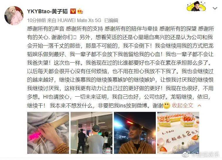 在长文里,黄子韬首先感谢了外界所有的声音和所有的支持,称谢谢这些人。接着黄子韬说到“想看笑话的还是心里暗自高兴你的,还是认为公司和我会一落千丈的那些,那是不可能的,我不会倒下!我会继续用我的方式把龙韬月了做好,我一辈子也不会放下我爸爸给我的心血,我也一辈子都不会让我爸失望!”这段话倒是非常像黄子韬的风格,说话有些小拽,直接了当,又不失少年的热血。最后,黄子韬称自己会过得越来越好,而且自己本来不想说什么,无奈有人把他在别的平台的言论放到了微博,所以才会出来说话。