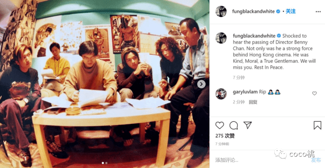 谢霆锋把陈木胜称为Benny导演、恩师,博文写得相当真挚: 不管是演戏还是做人,都深深影响着我。 两张照片,拍摄时间不同,但都是1999年上映的《特警新人类》的主创。