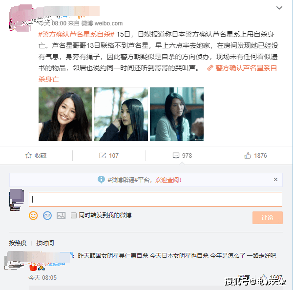 而就在吴仁惠被宣布去世后,隔壁的日本也传出了一位女星自杀的消息,她就是芦明星,她在9月14号被自己的哥哥发现死在自己的家中,死因也是自杀,年仅36岁的她事业本来很稳定,在今年开年的时候她参演的电视剧《忒修斯之船》还刚刚开始播出。