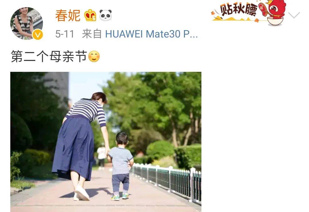 虽说之前两人对于孩子并没有过多想法,但当时已经40岁的春妮却意外怀孕,其实女性还是有母爱这种先天本领,一直有排斥状态的春妮选择生下孩子,并取名叫刚好!也是十分有寓意,如今三口之间也是十分幸福,母亲节春妮还分享了一张自己牵着儿子走路的背影照,并配文称第二个母亲节,画面温馨,想必一家三口也是十分幸福呀!