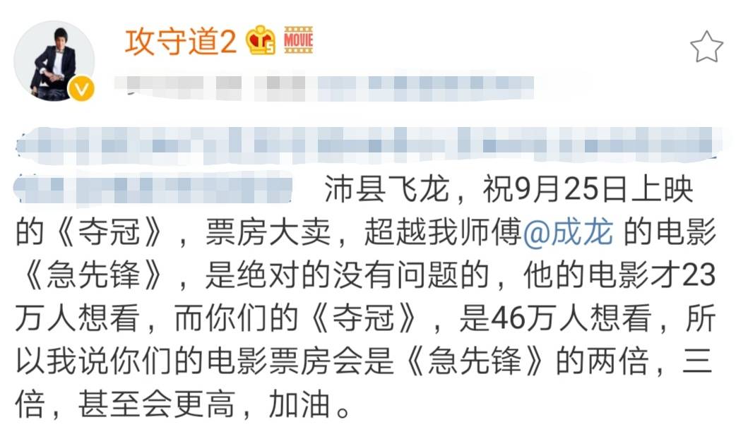 随即,飞龙该对成龙即将上映的新片《急先锋》予以嘲讽:“沛县飞龙,祝9月25日上映的《夺冠》,票房大卖,超越我师傅成龙的电影《急先锋》,是绝对的没有问题的,他的电影才23万人想看,而你们的《夺冠》,是46万人想看,所以我说你们的电影票房会是《急先锋》的两倍,三倍,甚至会更高,加油。”