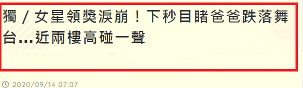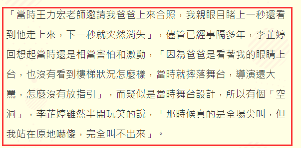 据台湾媒体的报道中指出,比赛当天,王力宏邀请李芷婷的爸爸上台合影,谁想上一秒他才走上台,下一秒就消失了,亲眼目睹全过程的李芷婷,回想起来还是相当的害怕和惊悚。李芷婷说,爸爸是看着她的眼睛上台的,没有注意楼梯状况,当时就摔下去了,当时导演还大骂,怎么没有放指引,据了解之所以有这个空洞,是当时的舞台就是这么设计的。