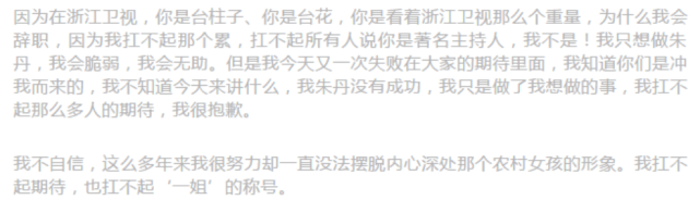 可是正因为越优秀被寄予的希望越大,希望越大压力也越大,朱丹有过硬的实力,但却没有一颗处理高压的强大内心。在这样的情况下,朱丹在最好的时候,离开了浙江卫视,跳槽去了湖南卫视。