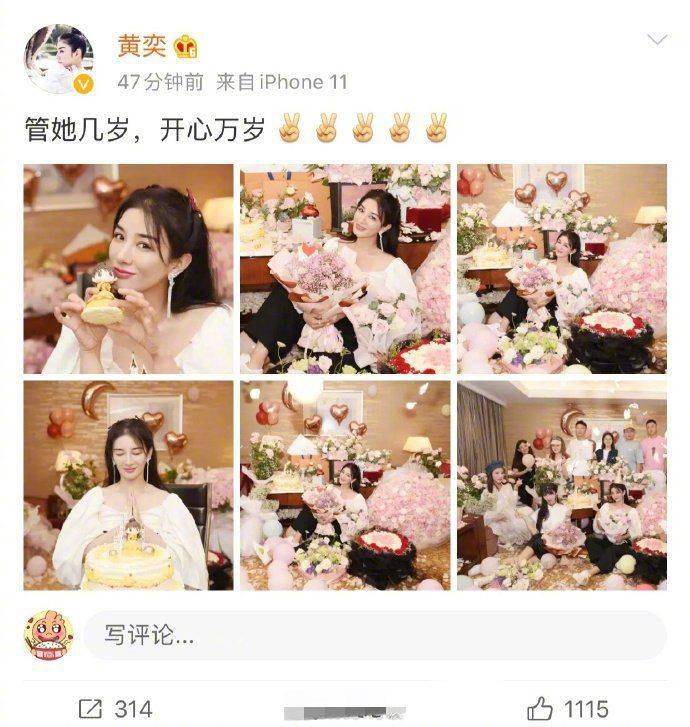13日,黄奕在微博上晒出自己的生日照,高调为自己庆生。庆祝自己生日快乐,还配文道:“管她几岁,开心万岁”。