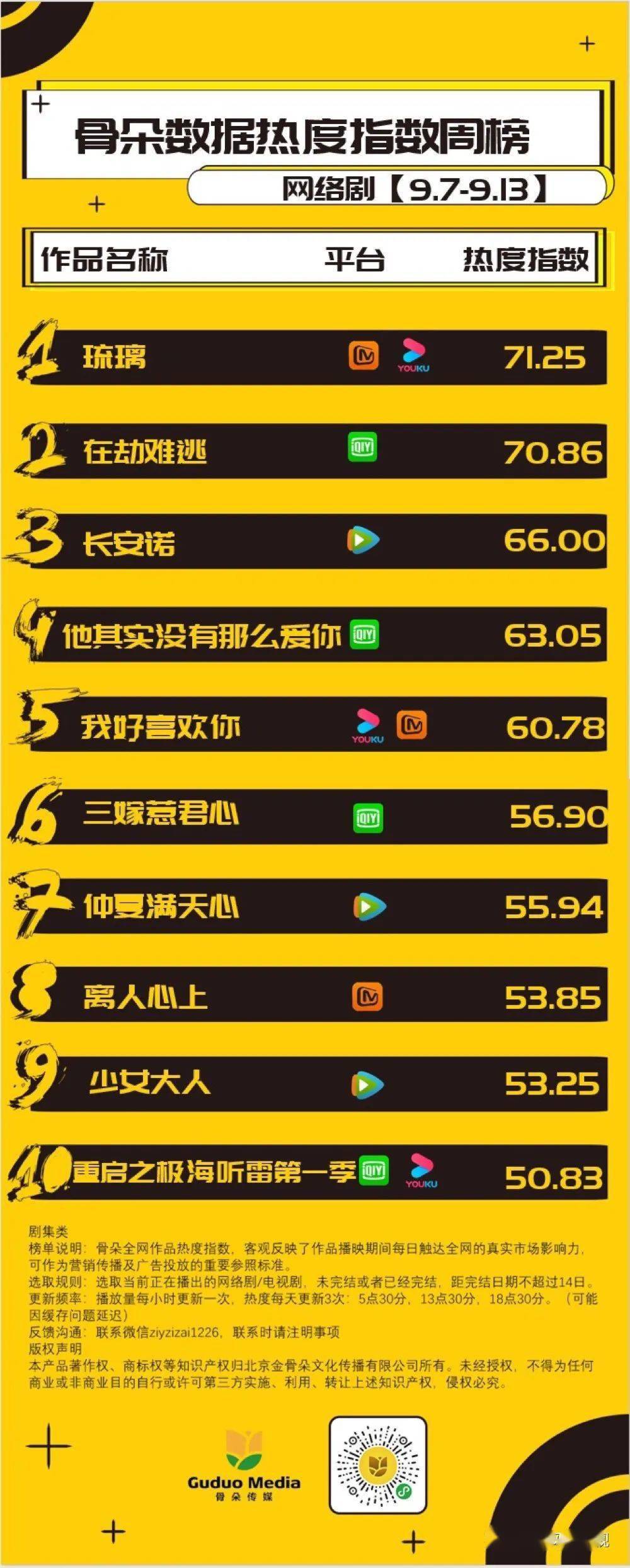 本周《琉璃》由上周的74.59的热度值降至71.25,仍位于周榜第一,轻科幻悬疑剧《在劫难逃》排名第二,上周开播《长安诺》位居第三。
