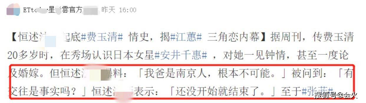 而费贞绫却在此次访问中否认了费玉清与安井千惠的恋情传闻,她爆料道:"我爸是南京人,根本不可能。"再三追问下,她又透露称:"(两人)还没开始就结束了。"