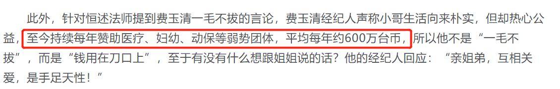 费玉清的经纪人还表示费玉清德艺双馨,虽然自己他自己生活节俭,但绝对没有对不起家人。此外,奚宜还列举了近年来费玉清参与和资助的慈善项目,说他每年花费在公益上的善款就有600万台币。