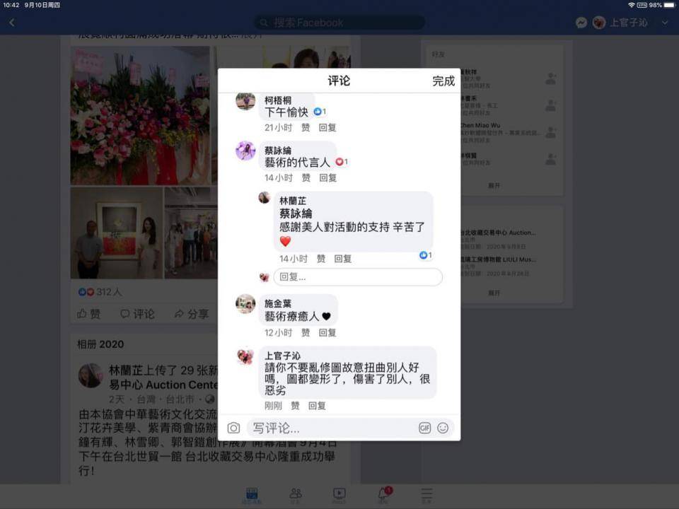 先来看下杨丽菁在社交账号上发出的状态,她表示去参加了朋友的画展,也开心的和朋友一起拍了照,不过没想到的是出了一件令人生气的事情,当时一起合影中的另外一名女星将她的脸型、身材修图修到变形,发布在粉丝团及群组供大家观看,让杨丽菁气炸了。