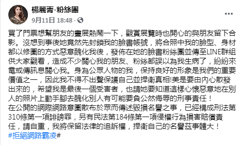 9月14日,据台湾媒体报道,女星杨丽菁日前在社交账号上发声称自己的照片被人恶意P图,照片中她的脸部直接变成了歪脸,导致不少粉丝担心她是否生病,因此发声澄清,并称将保留追究对方法律责任的权利。