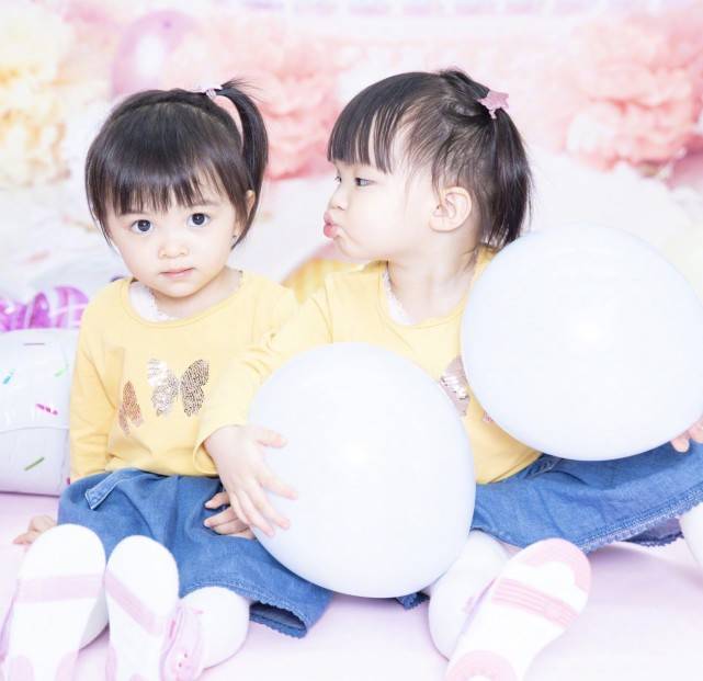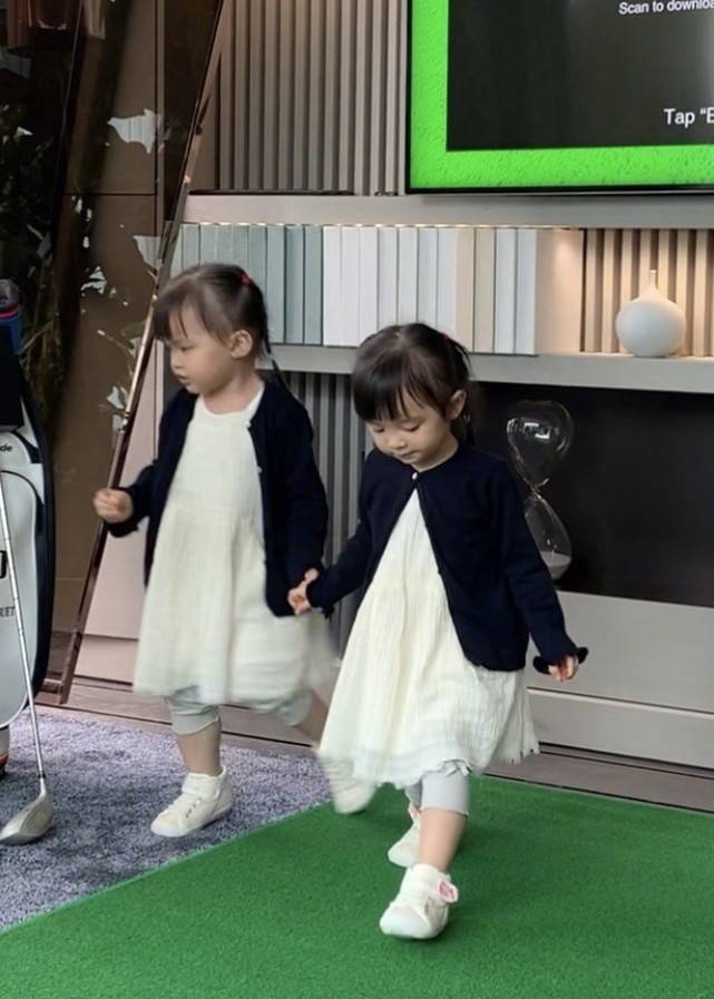 一对双胞胎女儿是超级可爱,虽然是双胞胎,但是两姐妹长得却完全不像,一个像爸爸一个像妈妈,照片中的姐妹俩穿着一模一样的服装,两个小可爱就像是洋娃娃一样,照片中的两个小家伙穿着纯白色的连衣裙,连衣裙外面搭配黑色的短款针织衫,穿衣风格有一种小少女的感觉,一对可爱的双胞胎也是长大了不少。