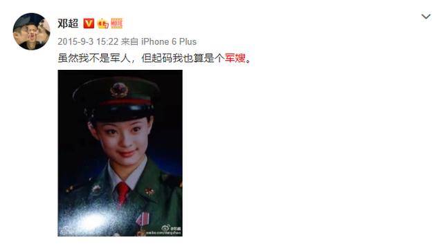 之后邓超用同一张照片发文说:虽然我不是军人,但起码我也算是个军嫂。超哥的幽默一直在线。