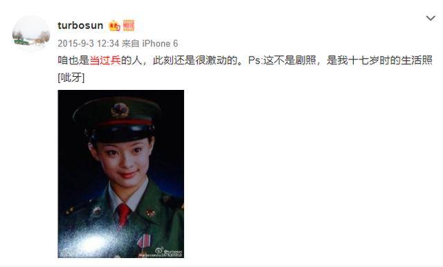 早在2015年,孙俪就曾晒过自己17岁时穿军装的生活照,并附文:咱也是当过兵的人,此刻还是激动的。强调这不是剧照。
