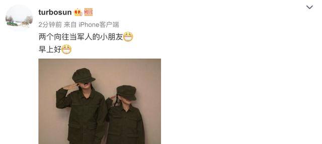 9月14日早上,孙俪分享了一双儿女穿着军装的同框照,并透露称两个小朋友向往当军人。