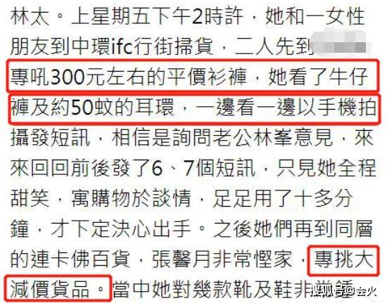 之前还有港媒爆料,张馨月和好友在平价百元服装店逛街,专挑价格在300元左右的衣裤,之后还选了50元的耳环。而张馨月挑好之后却没有立刻买单,而是拿手机询问老公林峯的意见,避免自己冲动消费。