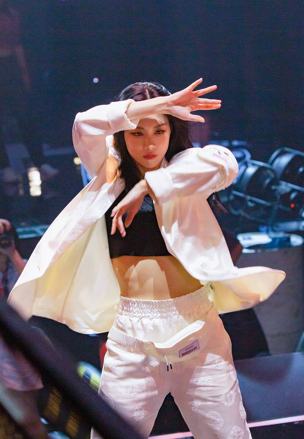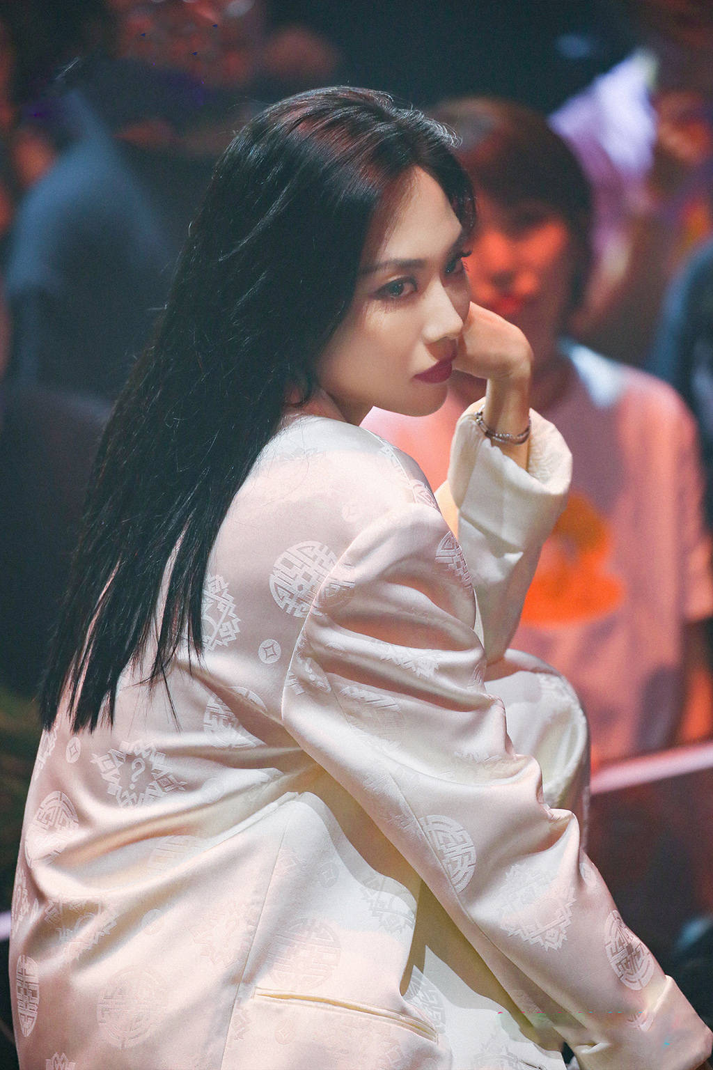 王霏霏作为专业舞者,日常训练身材线条自然没得说。一身白色潇洒风套装,诠释了职业女性的魅力。又有几分中国风的韵味,回眸间,飒气全场,一个眼神就赢了。