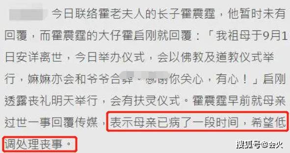 霍老夫人吕燕妮的长子霍震霆也表示,母亲其实早已病了一段时间,如今霍家上下都希望低调处理丧事,仪式不会办得太隆重。