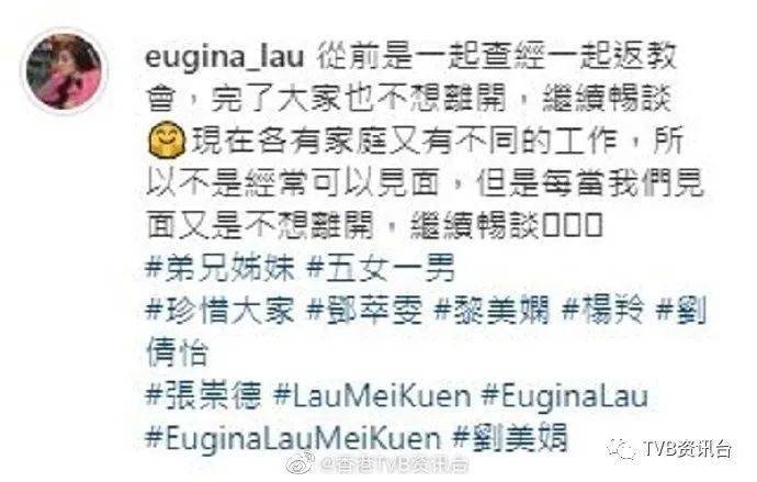 刘美娟喺社交网晒出合照,当中仲有佢老公张崇德,佢留言:“从前是一起查经一起返教会,完了大家也不想离开,继续畅谈 现在各有家庭又有不同的工作,所以不是经常可以见面,但是每当我们见面又是不想离开,继续畅谈。”