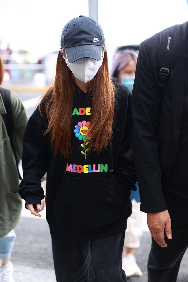 邓紫棋一身黑色look看起来很有嘻哈范儿,胸口一朵五颜六色的花朵抢眼,胸口的单词Medellin是是哥伦比亚的第二大城市麦德林。插兜低头赶路的模样酷美酷美的。