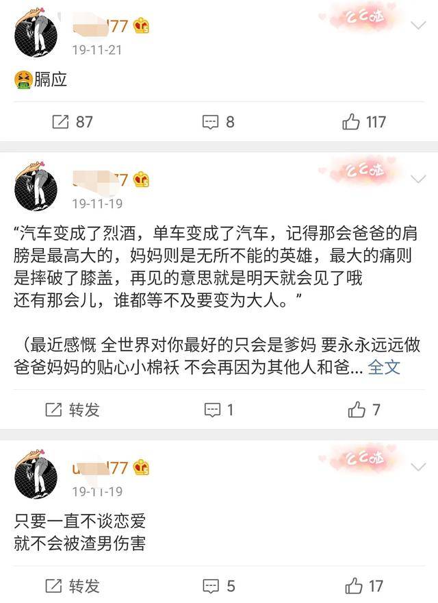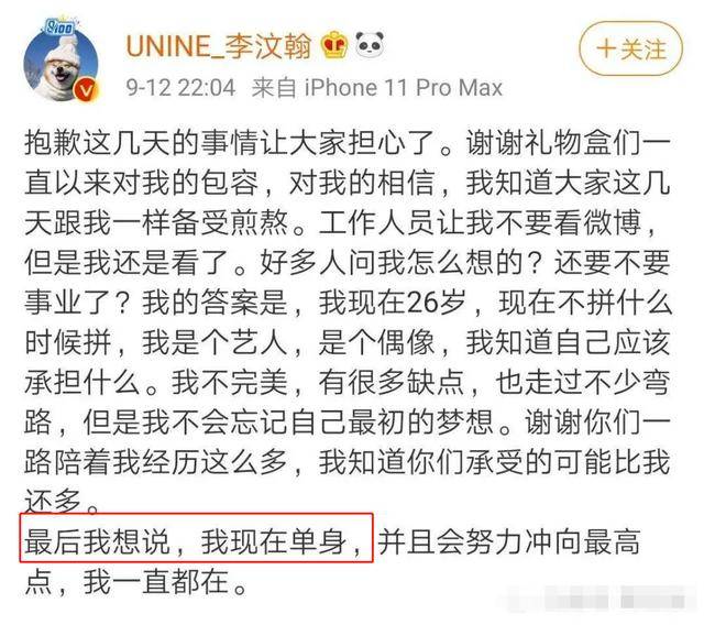 娱乐圈生存法则就是偶像恋爱事业必退步,李汶翰好不容易凭借选秀闯出了一点点名声,若因恋情毁掉确实可惜。但是,用不损毁事业宣布单身也着实不合适,若要有拼事业的心不舍得粉丝,那么就不要谈恋爱就好,何必要落得有了绯闻就立马撇清关系轮番被前任锤呢?看时间线,李汶翰从糊到小红恋情几乎没有断过。