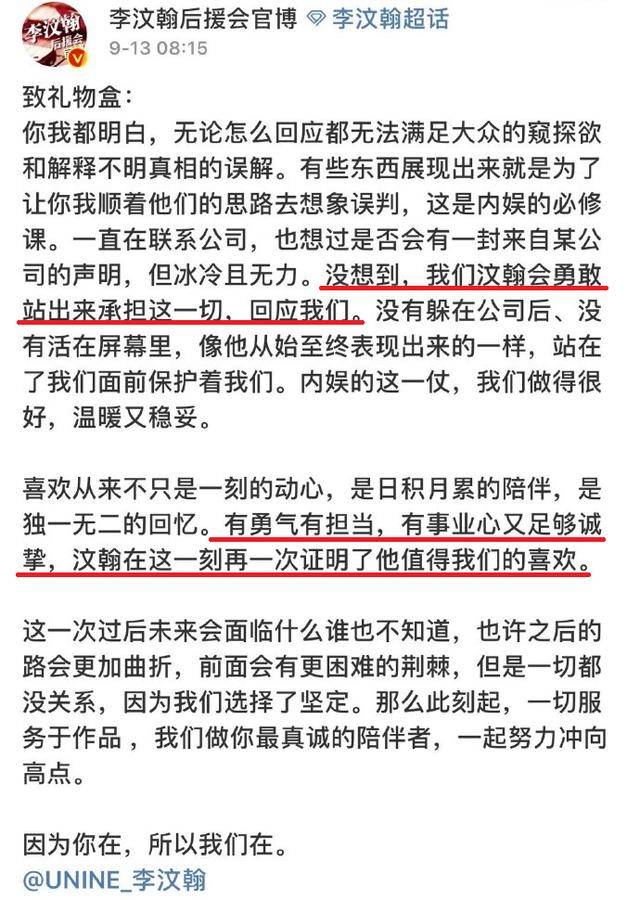 虽然路人都在吐槽,但粉丝显然很满意李汶翰的回应,以李汶翰后援会为代表的粉丝夸赞并表态会继续支持他:“有勇气有担当,有事业心又足够诚挚,汶翰这一刻再次证明了他值得我们喜欢”。