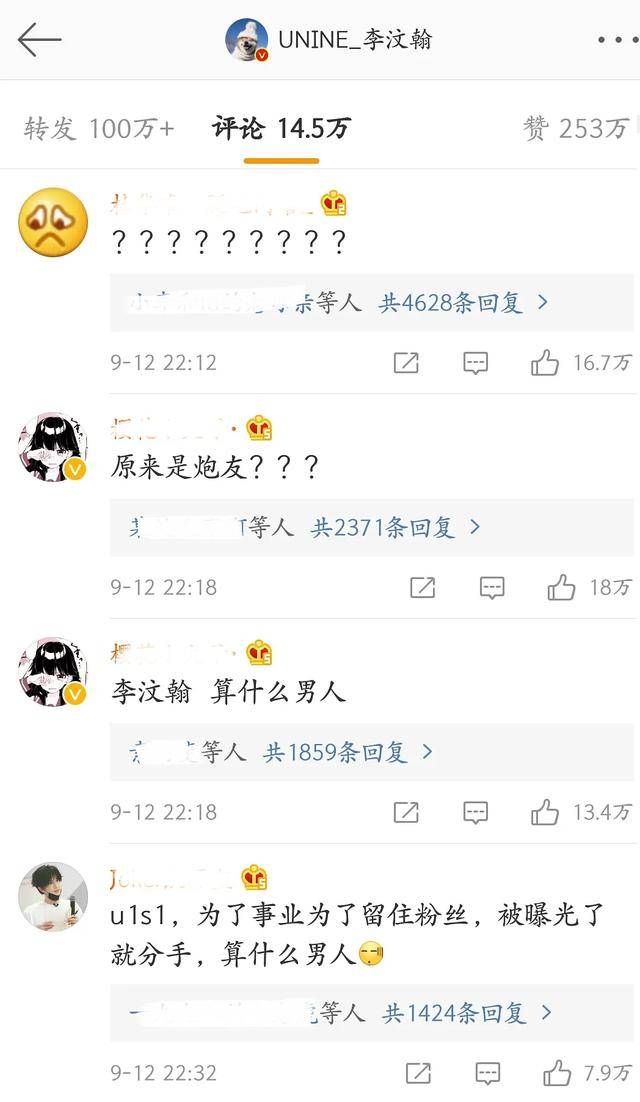 李汶翰的回应一出,粉丝压根控不住评论区,高赞的评论几乎都是路人的真实吐槽,觉得他为了安抚粉丝选择跟女朋友分手很没担当,大家还说要点一首周杰伦的《算什么男人》送给他。