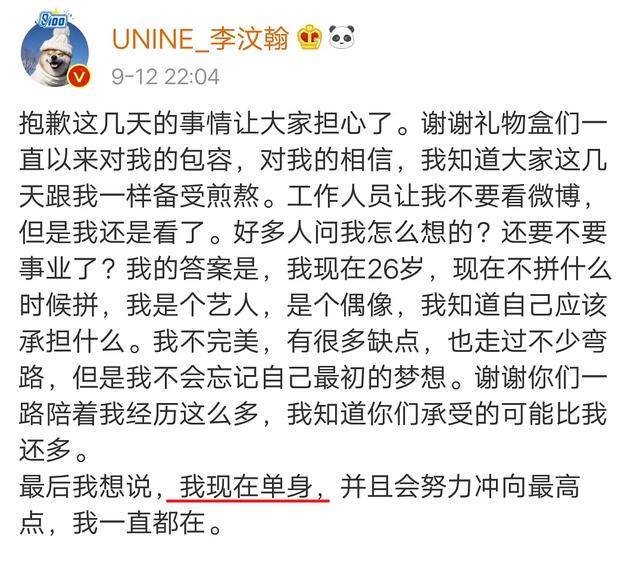 李汶翰沉默了2天,昨晚终于回应了,先是说这几天自己备受煎熬,继而说自己不会忘记最初的梦想,最后强调“我现在单身”,合起来的话,是不是可以理解为煎熬了几天不知道该怎么向粉丝交代,最后下定决心跟易易梓撇清关系?