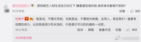 此前张馨予就为女演员发声,不希望网友对女演员的胖瘦太过于苛刻,并且大方分享了自己曾经胖的时候被嘲笑时的心里状态:“皮肉的美,终究抵不过一颗赤子之心。”随后,有网友回复道“艺人想赚钱难道不保持身材吗”,张馨予也霸气回应到“自己也控制,大部分时间都不吃晚饭,我是说不要太苛刻,不要因为胖瘦去骂人。”