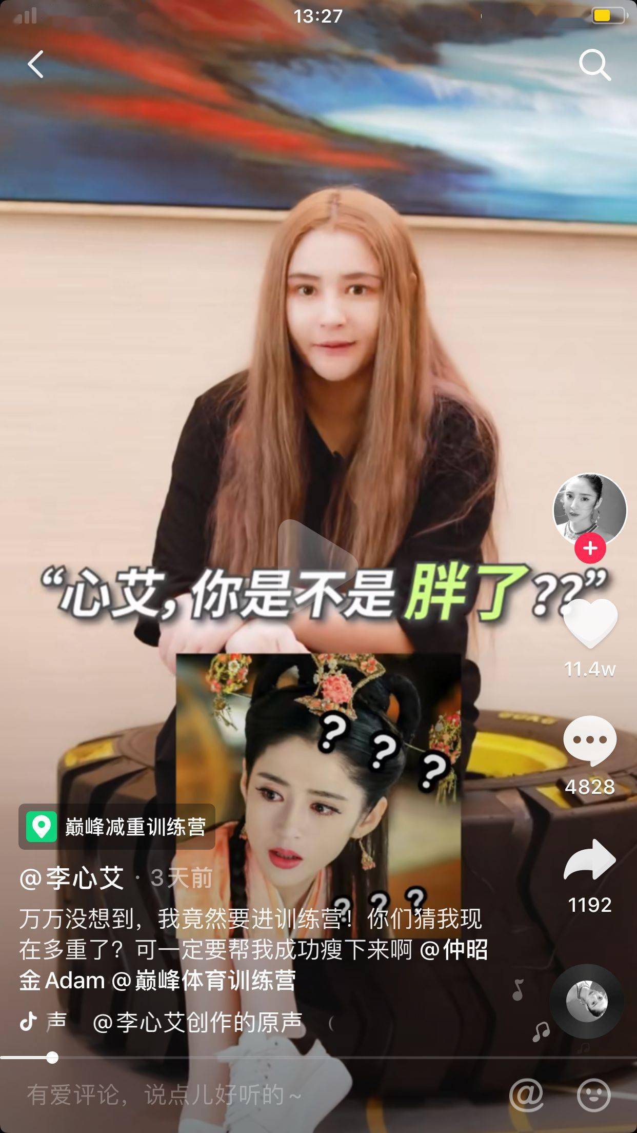 视频中,李心艾大方承认自己胖了很多,并表示自己是一个易胖体质又特别喜欢美食的人,所以体重一直是自己作为演员的一大困扰,并且也叫广大网友一起监督自己减肥。看着照片真是胖了1.5个自己啊。