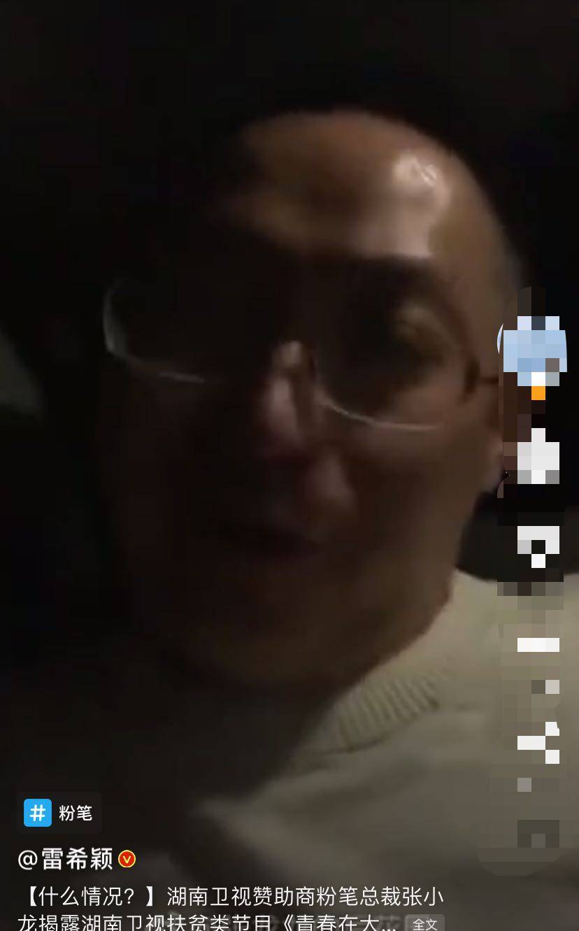 网上流传出一个视频,粉笔网创始人及CEO张小龙曝芒果台扶贫节目《青春在大地》作假,称自己被同事硬拉来,节目本身出发点是好的,但节目却很假,通过剪辑和编辑手段,把人搞哭,认为自己走街串巷,明星只是出镜十多分钟,根本不了解。认为节目是对上宣,意思是对上面宣传,敷衍大家。认为自己是道具人,也准备了很多,其实是狗屎,冠名商粉笔也是狗屎,明星、节目都是狗屎,看到的都是假的,内容都是编辑剪辑,只拍结果,还哭得稀里哗啦。