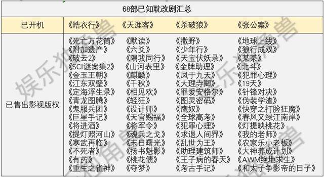 现阶段,除了已播的《鬓边不是海棠红》《成化十四年》,和已杀青或已开拍的四部耽改剧《皓衣行》(原著《二哈和他的白猫师尊》)《天涯客》《杀破狼》《张公案》外,据娱乐独角兽不完全统计,仅目前已售出影视版权、备案、或开机的耽改剧项目来看,数量便多达68部。
