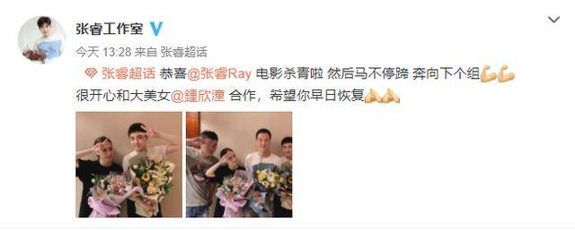 照片中,阿娇身穿白色短T,手捧一束花,剪刀手遮住额头受伤的位置,而张睿则白色短T,同样的花束与造型,非常配合阿娇的动作。