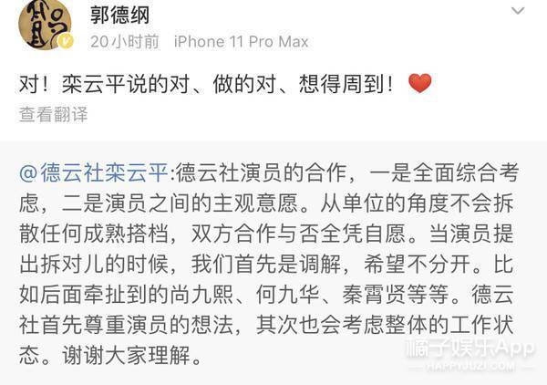 班主郭德纲留言并转发,表明自己态度;