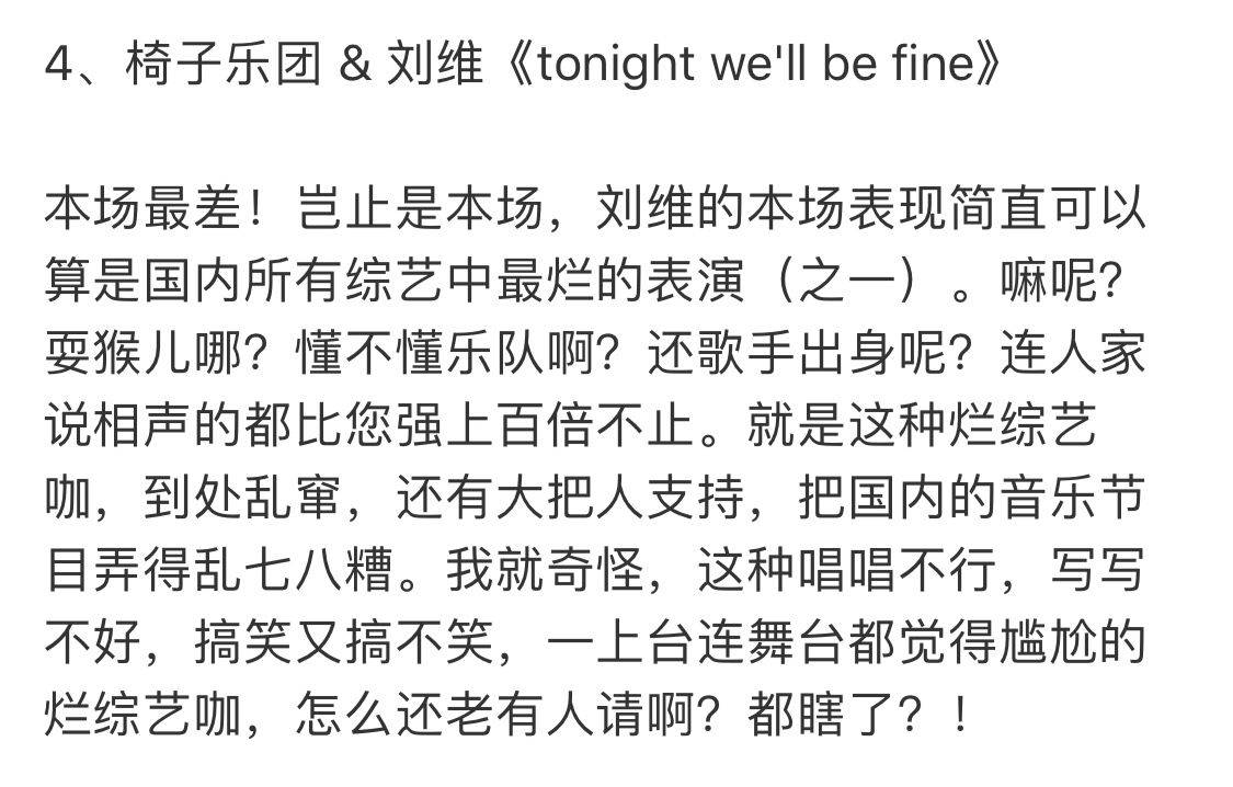 因为在《乐队的夏天》中表现的不够好,当晚的助演嘉宾、专业歌手刘维,被乐评人丁太昇怒斥是“综艺混子”。