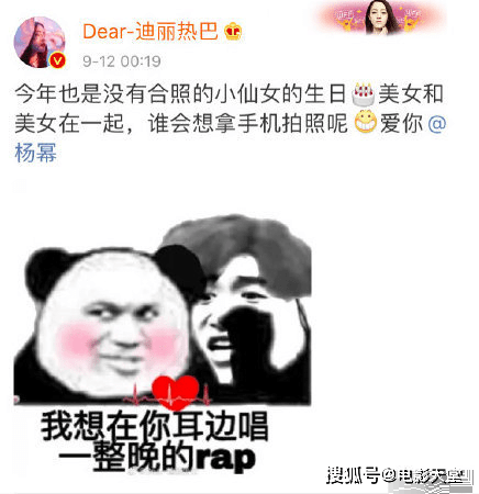 甚至大多数吃瓜群众更相信第二者,毕竟娱乐圈只有利益哪有什么感情的。 不过此次杨幂生日之际,热巴在微博发文给姐姐庆生也是打破了这种说法。微博中热巴配文:“今年也是没有合照的小仙女的生日,美女和美女在一起,谁会想拿手机拍照呢,爱你”并艾特了杨幂。从文案中也能看出两人的感情绝不至于向外界传的那么不和,不过热巴却因为配图在网络上被蔡徐坤的粉丝各种diss。