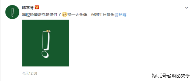随后陈学冬“被迫”也换了一张粉丝们的同款头像,并表示:“满腔热情终究是错付了,换一天头像…祝您生日快乐“。杨幂随后回复:“我很喜欢这个绿油油的头像,希望你也是”。