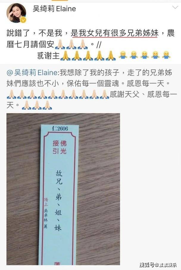 而事后吴绮莉解释又说搞错了,是她愿意为女儿的那些兄弟姐妹们带来祝福,而不是指自己!