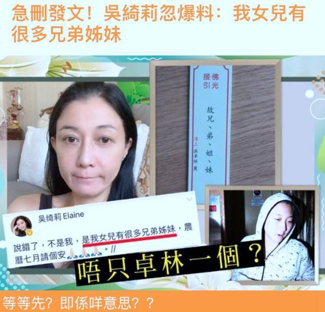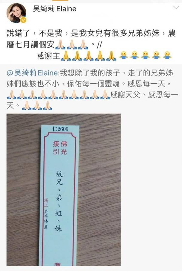而吴绮莉在留言中解释:“说错了,不是我,是我女儿有很多兄弟姐妹,农历七月请个安。”但之后吴绮莉删去贴文。