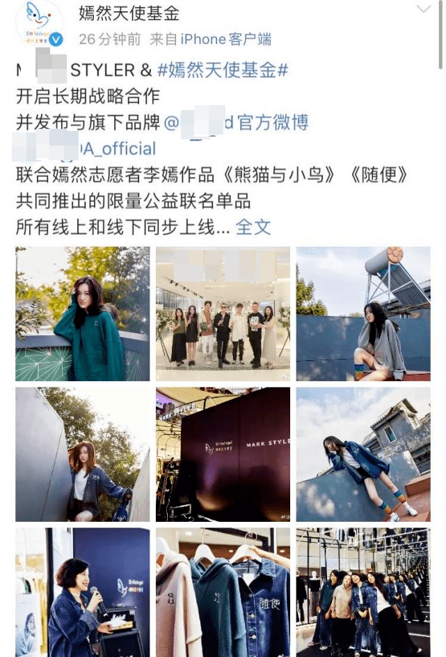 9月12日,嫣然天使基金官博发文宣称与服装品牌开展合作,联合嫣然志愿者李嫣创作的《熊猫与小鸟》和《随便》推出限量公益联名衣物,所有销售所得都会赠予嫣然天使基金。